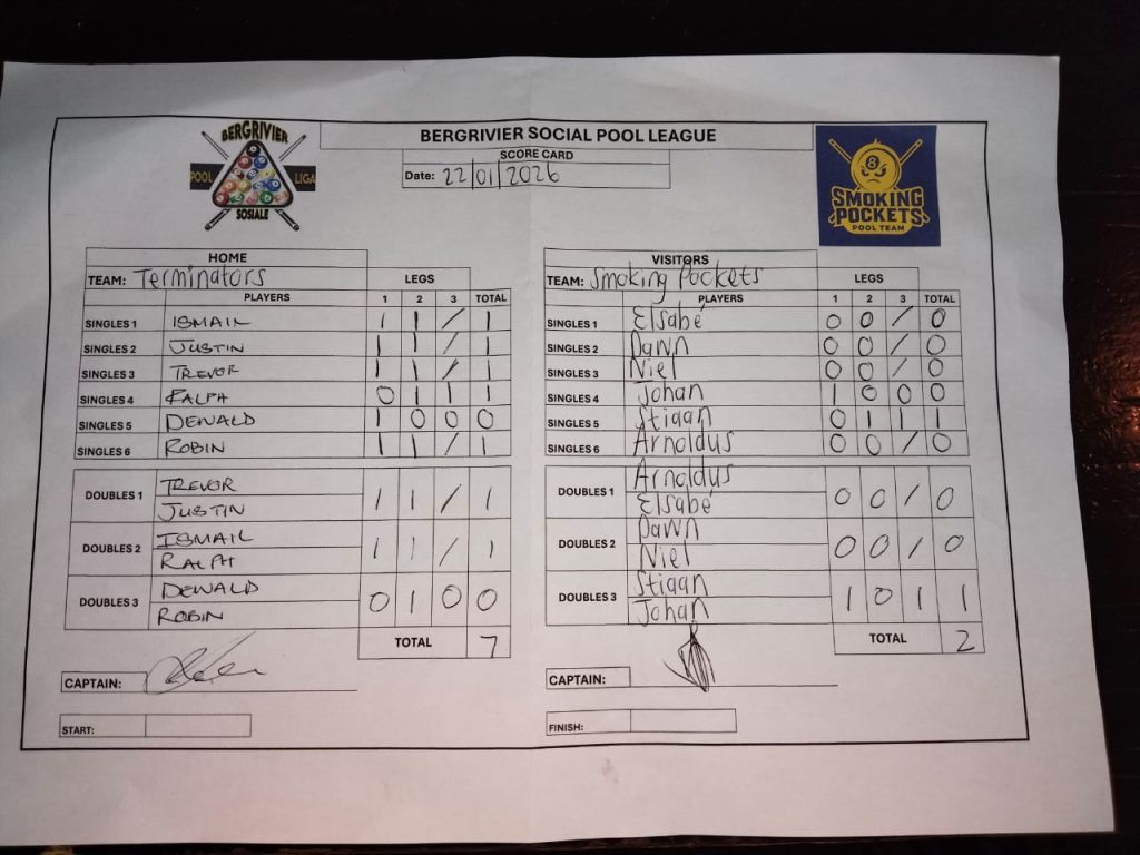 22 January 2026 7:00 pm Bergrivier Sosiale Pool Liga 2026 Summer