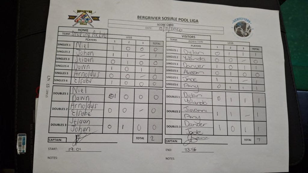 5 February 2026 7:00 pm Bergrivier Sosiale Pool Liga 2026 Summer
