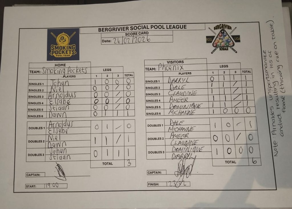 26 February 2026 7:00 pm Bergrivier Sosiale Pool Liga 2026 Summer