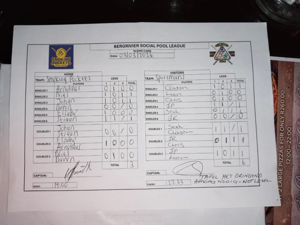 3 March 2026 7:00 pm Bergrivier Sosiale Pool Liga 2026 Summer