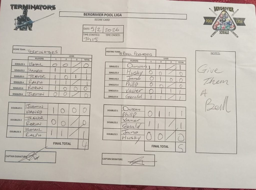 5 March 2026 7:00 pm Bergrivier Sosiale Pool Liga 2026 Summer